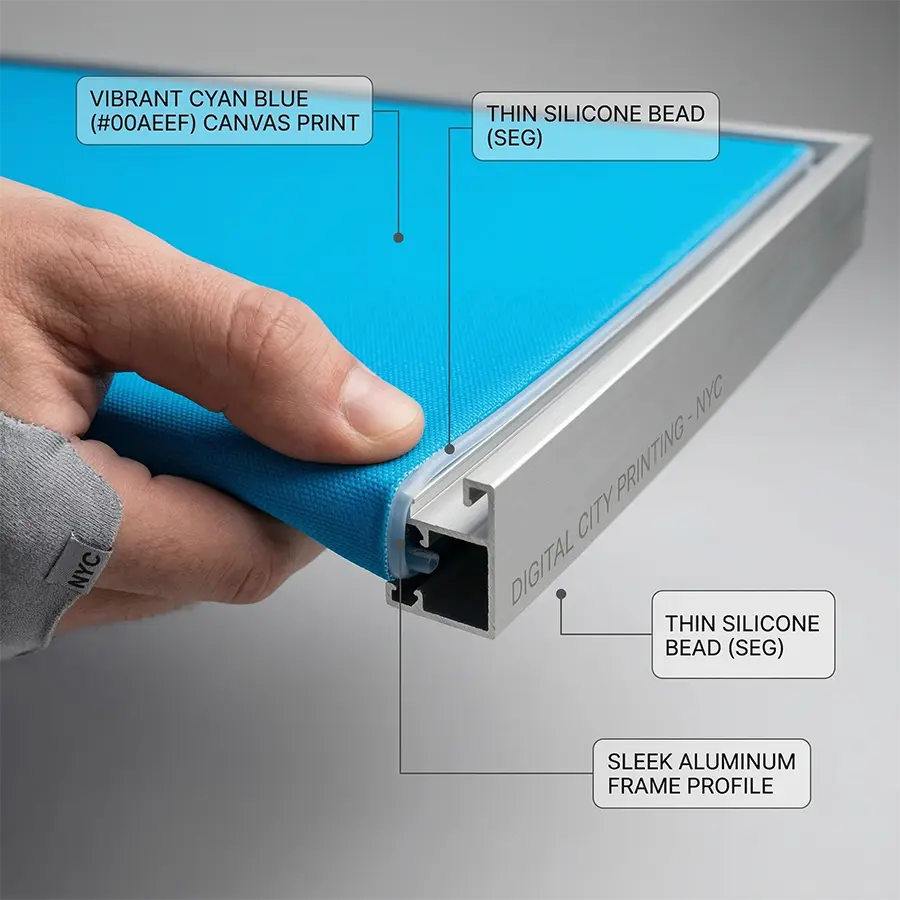 SEG Canvas (Silicone Edge Graphics): Designed for trade shows and modern retail environments, our SEG canvas printing services feature a high-resolution fabric canvas with a thin silicone bead sewn around the edge. This bead easily presses into an aluminum frame, creating a perfectly tensioned, frameless display that is incredibly lightweight and easy to update.
