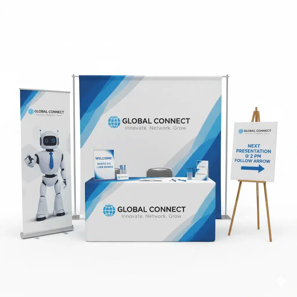 - Branded Tablecloths & Skirts: Professional and cohesive, these enhance your table setup, reinforcing your brand identity across your entire display.