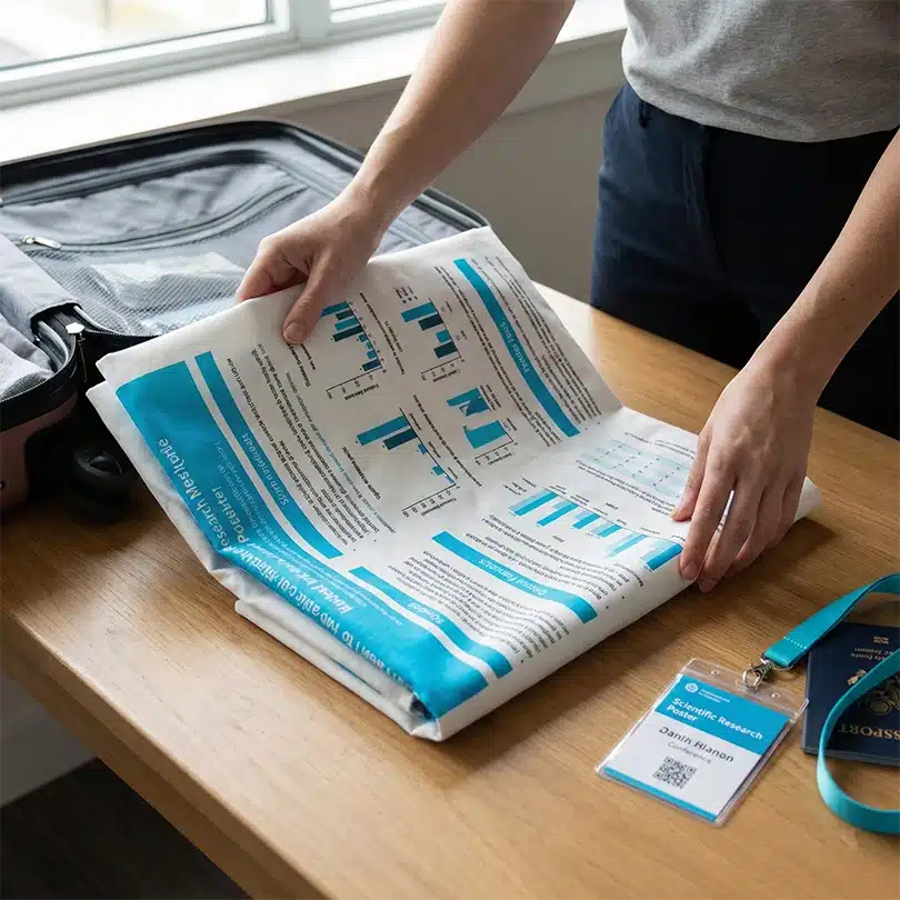 Answer: Yes! Our foldable fabric poster printing is specifically designed for traveling academics. This wrinkle-resistant poly-blend material allows you to fold your poster like a shirt and pack it in your carry-on luggage, eliminating the need to carry a bulky tube on the airplane.